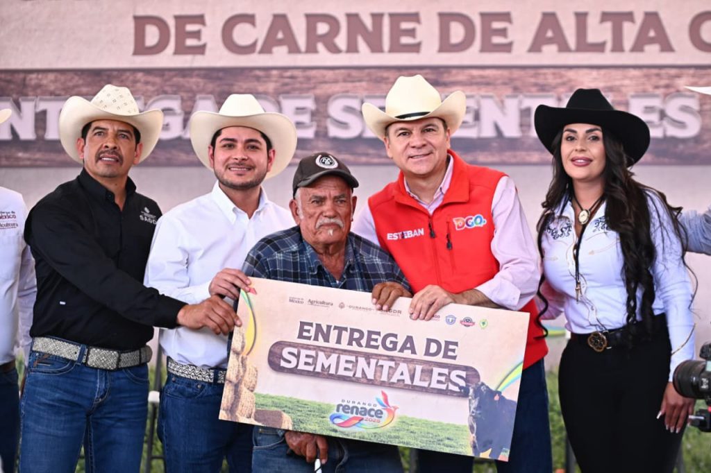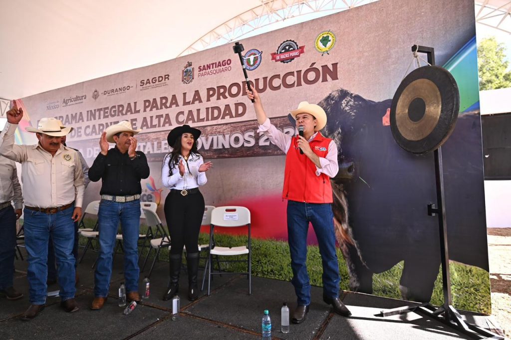 Santiago Papasquiaro, Dgo.– En Durango estamos trabajando para sacar adelante la ganadería y la agricultura de la entidad, señaló el gobernador Esteban Villegas Villarreal, acompañado por Arturo Macosay Córdova, coordinador general de Ganadería en SADER, durante la entrega de 162 sementales bovinos a productores de seis municipios, como parte del Programa Integral para la Producción de Carne de Alta Calidad, desarrollado en coordinación con el Gobierno Federal.