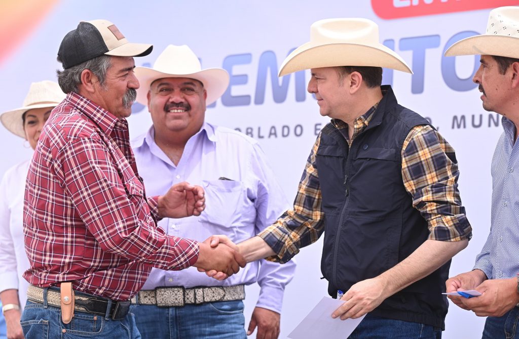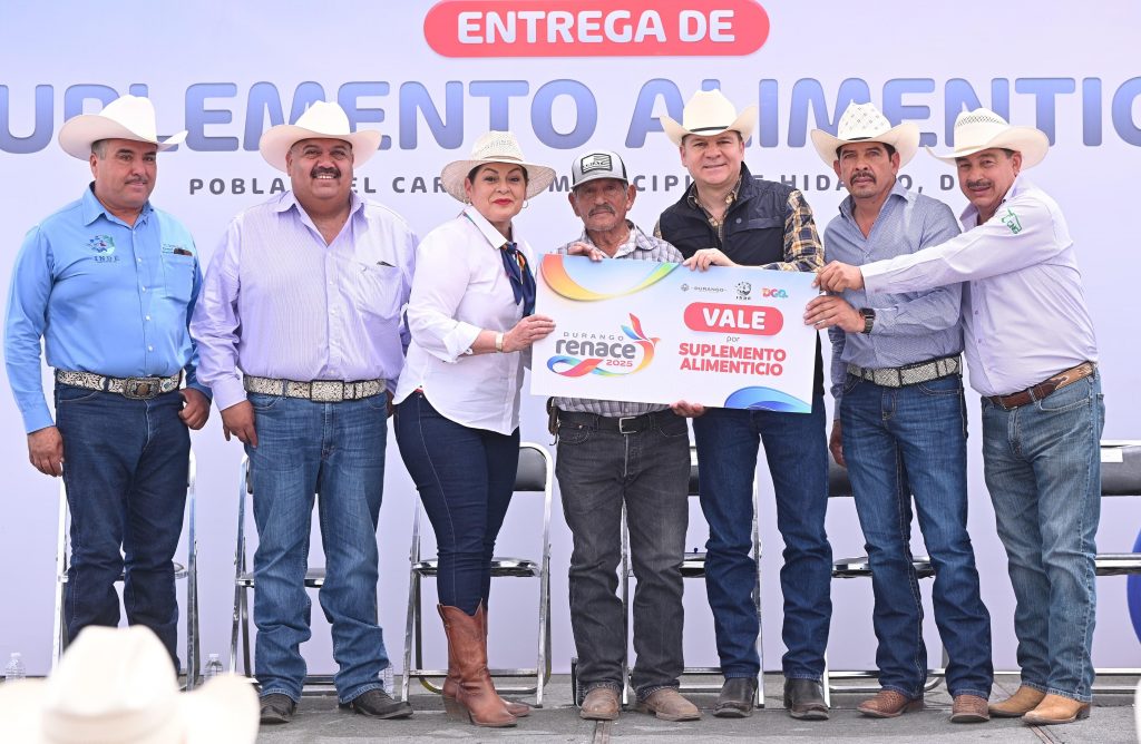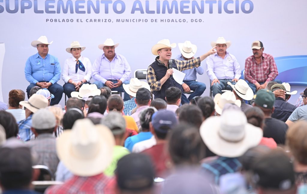 Hidalgo, Durango.- Como parte del compromiso de apoyar al campo en todas las regiones del estado, el gobernador Esteban Villegas Villarreal encabezó en la localidad de El Carrizo la entrega de suplemento alimenticio de alta calidad para fortalecer el trabajo ganadero. En esta jornada se benefició a más de mil productores de los municipios de Hidalgo, Indé y Ocampo, con una inversión superior a los 2 millones de pesos para distribuir 260 toneladas de maíz molido en apoyo a más de 10 mil cabezas de ganado.