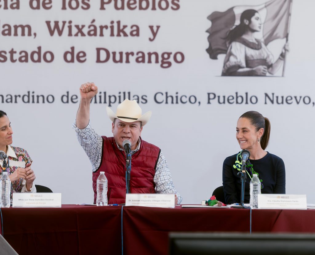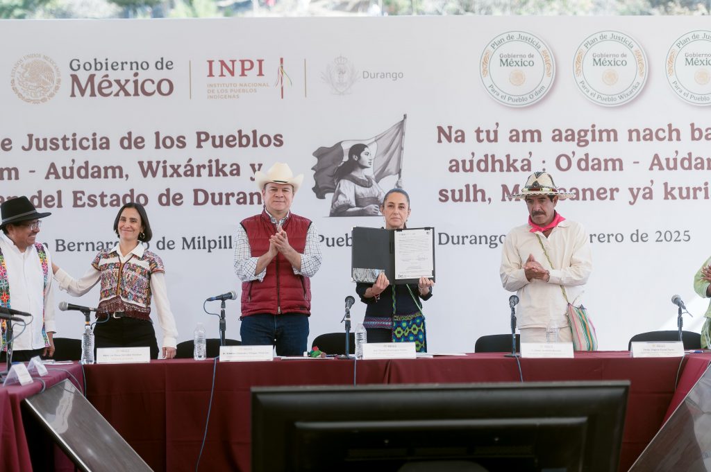 San Bernardino de Milpillas Chico, Pueblo Nuevo, Durango.- La Presidenta de la República, Claudia Sheinbaum Pardo junto al gobernador Esteban Villegas, encabezó la presentación del Plan de Justicia de los Pueblos O’dam – Au’dam, Wixárika y Mexikan del Estado de Durango, con el compromiso de mejorar la infraestructura, salud, educación y conectividad en las comunidades indígenas; “no vinimos solo a echar rollo, vinimos a comprometernos”, afirmó al detallar las acciones que beneficiarán a los pueblos originarios.
